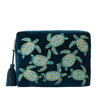 A beautiful large wash bag, designed with a turtle conservation motif, on a marine blue velvet base, to honor one of the ocean's most beautiful creatures.