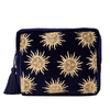 A beautiful cotton velvet wash bag featuring a gold sun goddess embroidered design, on a beautiful navy base.