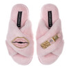 Featuring a beautiful double lips and lipstick brooch, nestled on classic soft pink faux fur, these slippers make a great gift or treat for yourself. With a slip on, cross over style, and a rubber sole with a non-slip grip, these are perfect for indoors, but can also be worn outside for short periods of time.