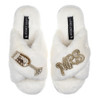 Featuring a beautiful double Mrs and Champagne brooch, nestled on classic soft white faux fur, these slippers make a great gift or treat for yourself. With a slip on, cross over style, and a rubber sole with a non-slip grip, these are perfect for indoors, but can also be worn outside for short periods of time.